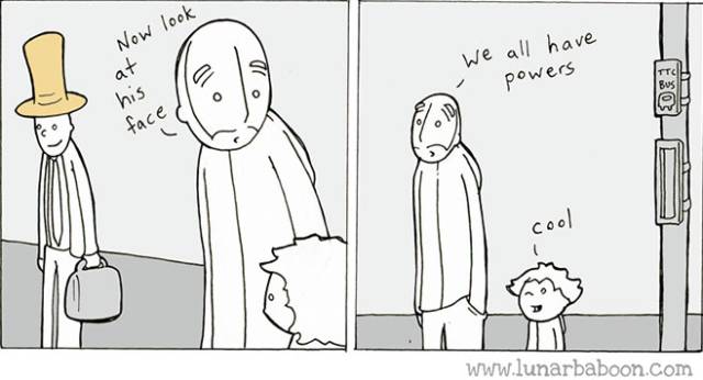 这时,我再让儿子看,“现在,看看那个人的表情,我们都有超能力。”