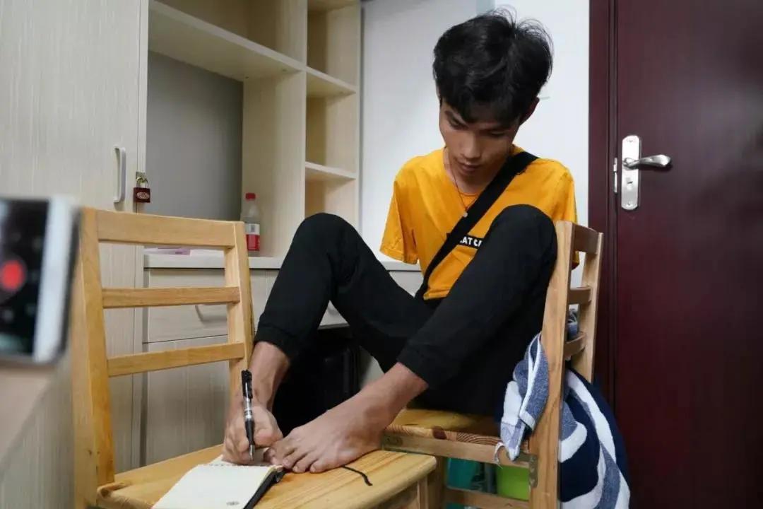 1999年,朱鹏刚刚3岁,在户外活动时不慎触及高压电线,双臂被截肢。从医院出来的第二个月,父亲朱峰华为了儿子能够面对未来的生活,狠心逼着朱鹏每天用脚训练写字。