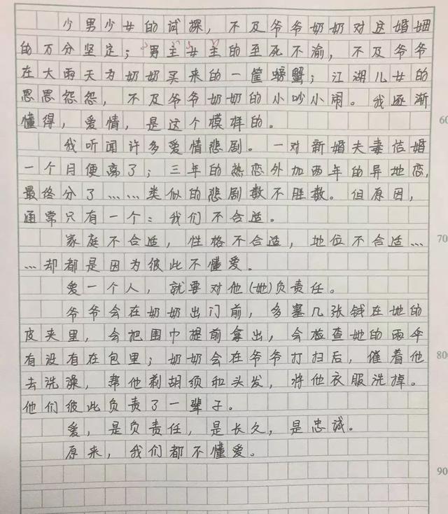 女生叫滕霏,前几天,语文老师布置了一篇命题作文《原来我们不懂爱》,说可以从身边人、身边事写起,写出自己的真实感受。学生们的文章交上来,十四五岁的他们,对情感的理解之深让老师非常感叹,其中滕霏的文章最让老师惊讶:“小小年纪,她很会观察和思考,对爱情的理解比很多成人都要深刻。”